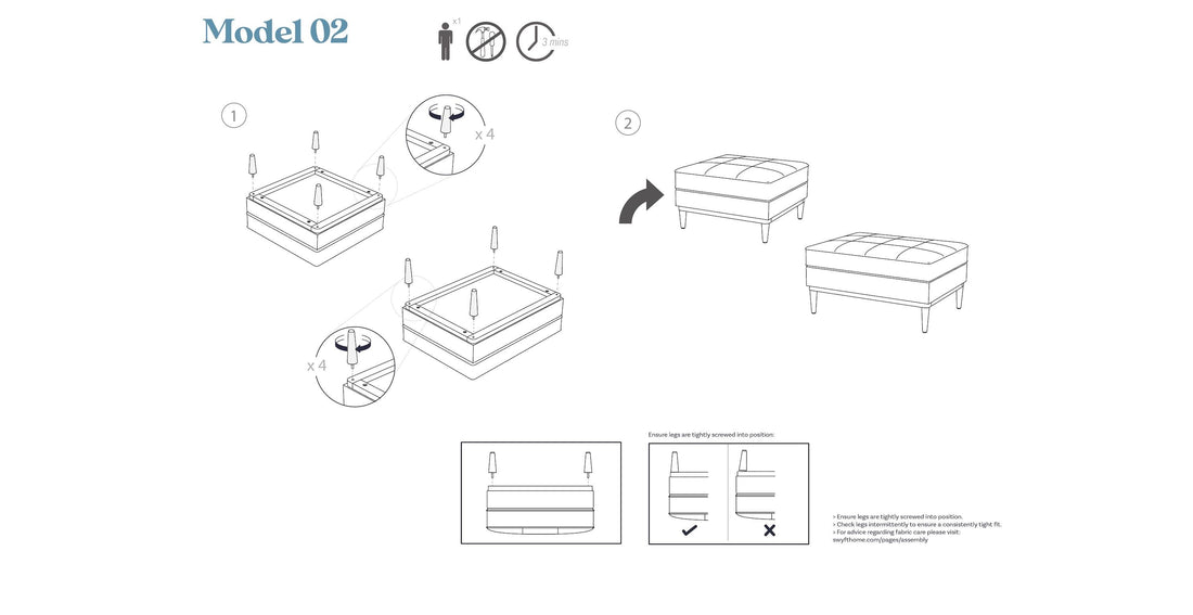 The Model 02 ottoman is everything you expect from the Model 02 design. Its pulled seam and piped detail mirrors that of it's sofa counterpart, made with high-density dual-layered foam to guarantee the same level of comfort. The Model 02 ottoman can be paired with any Model 02 to create a corner sofa, or it can be used as a standalone piece for extra seating or a substitute coffee table.