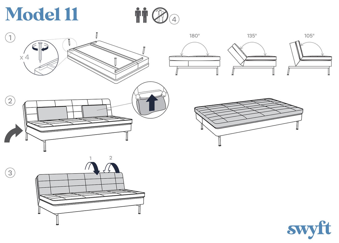 With a simple design, the three-seater sofa bed integrates well into any interior environment. Made for compact spaces, the sofa’s back has three angles: seating 105º, lounge 135º, and bed 180º — this makes the Model 11 perfect for multi-functional use.