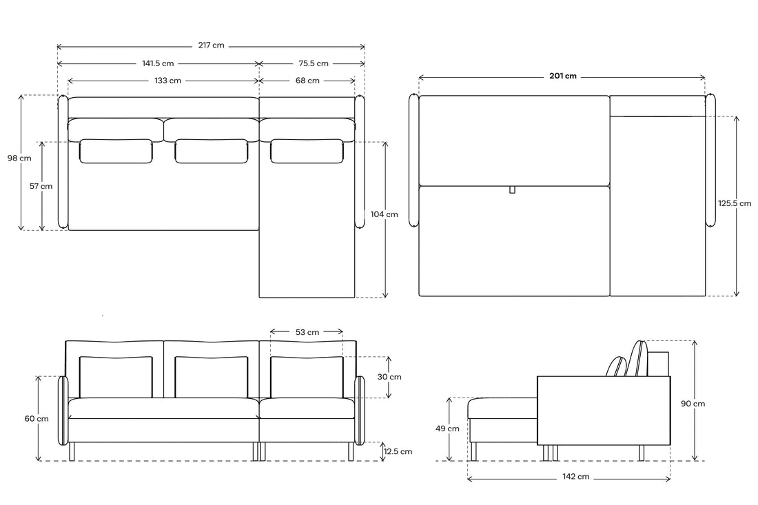- Sofa Storage: W124.5 x D63 x H14.5cm (114 Ltrs)